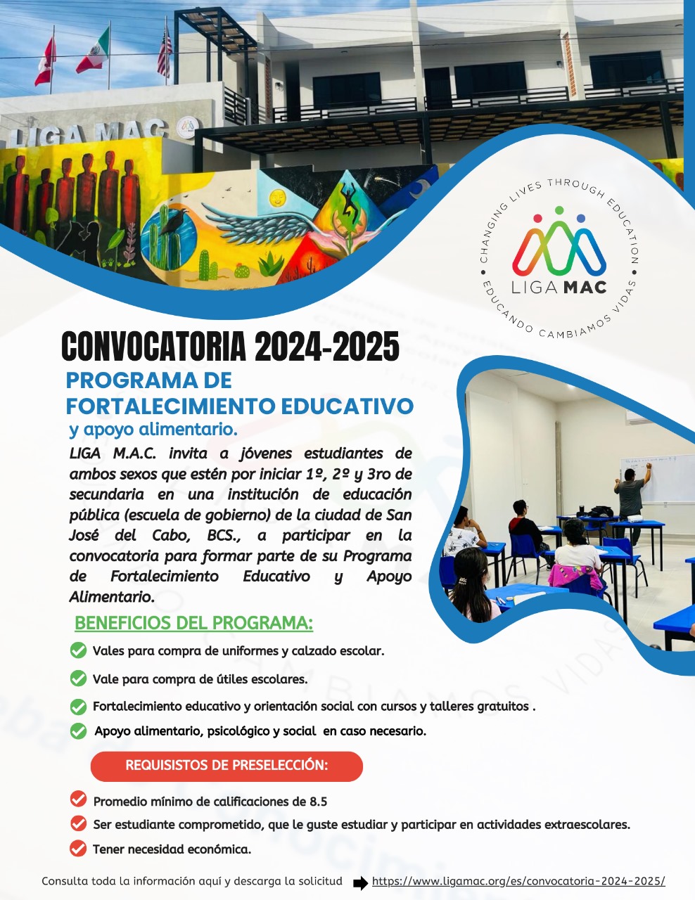 Las solicitudes están abiertas a todos los estudiantes que ingresarán a primero de secundaria en cualquier escuela pública de San José del Cabo. Sin embargo, tenemos algunos espacios para estudiantes que pasarán a segundo y tercero de secundaria. Este año Liga MAC busca a 48 estudiantes nuevos de primero de secundaria y a 30 más para llenar espacios entre segundo de secundaria y tercero de preparatoria. Las solicitudes de preparatoria se recibirán en lista de espera, mismas que serán consideradas dependiendo de las bajas que tengamos en ese nivel.