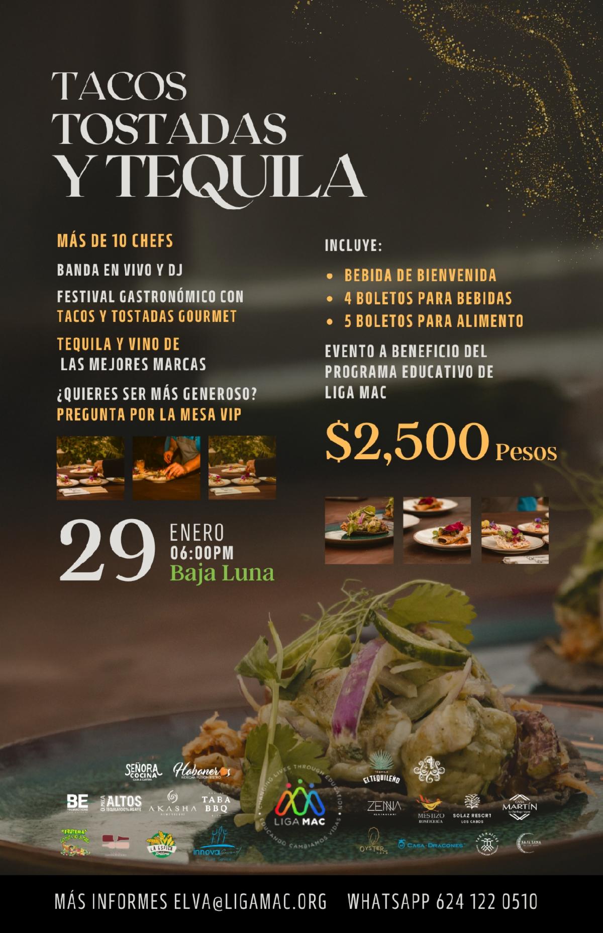 El evento TTT contará con creaciones gourmet únicas de tacos y tostadas diseñadas por 13 reconocidos chefs locales que tendrán maridaje con tequila o vino. Estos no son los tacos comunes que comemos en nuestra taquería de costumbre. Son verdaderas obras de arte culinario, que además de hermosas a la vista son exquisitas al paladar. Los jardines de Baja Luna tienen un amplio espacio para que los asistentes al evento vayan de una estación de comida a otra y disfruten de un hermoso ambiente creado por la decoración proporcionada por Del Cabo Events. La música en vivo será de Soundays que alternando con música continua de DJ proporcionarán una velada muy animada. ¡Tadd garantiza que nadie volverá a casa con hambre! Cada boleto al evento incluye 5 selecciones de comida y una bebida de bienvenida más 4 opciones de bebidas. Para quienes se sientan más generosos y deseen contribuir más, habrá mesas VIP con servicio dedicado, comida ilimitada, además de ubicación preferente.